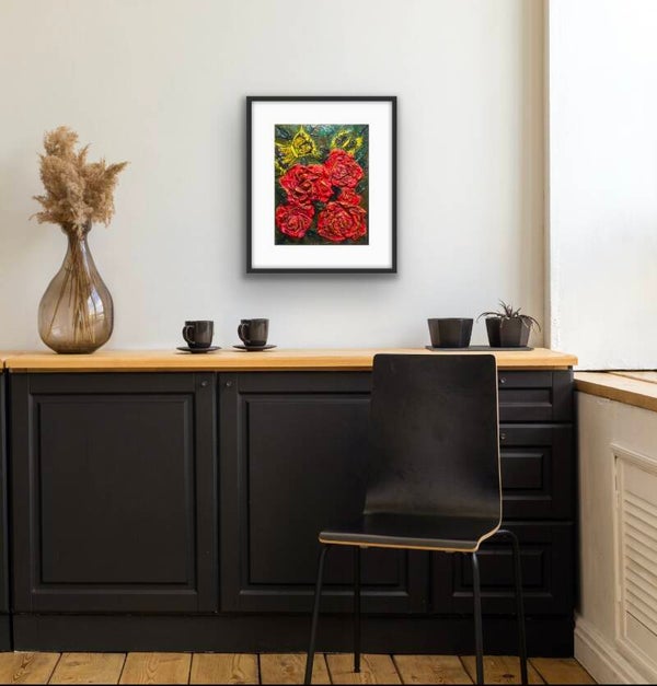 11x14 framed. Beautiful 3-D Roses with plush leaves fill this wooden canvas.